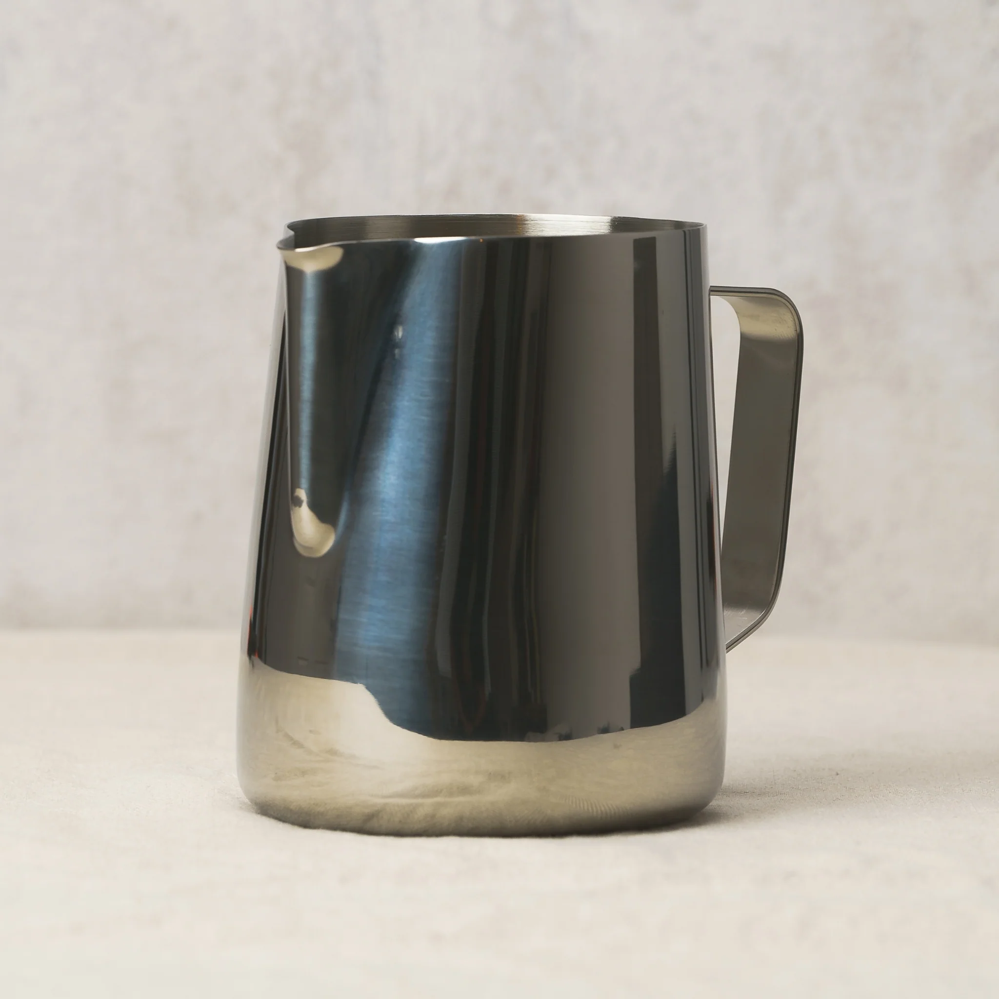 Professional quality straight sided Yagua Foaming Milk Jug with lined measurements etched on both sides for right and left handed milk frothing, improved accuracy and less wastage. Narrow spout for superior pouring control and latte art