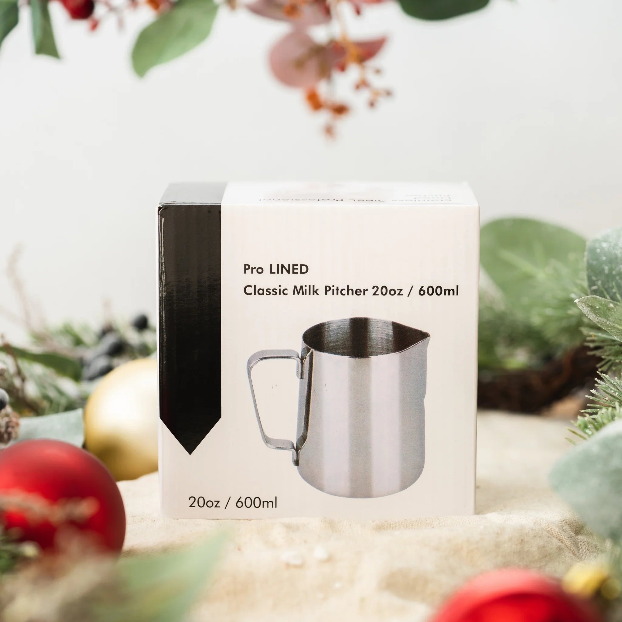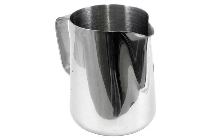 Professional quality straight sided foaming jug with lined measurements etched on both sides for right and left handed milk frothing, improved accuracy and less wastage.