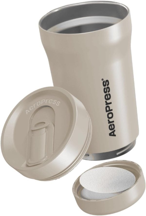 The Stainless Steel AeroPress Travel Coffee Tumbler is the perfect coffee lover’s companion for any adventure, whether it’s to the office, at a hotel or Airbnb, or on a road trip. The tumbler top is sized to support all standard size AeroPress brewers, like Clear & Original, making brewing directly into the tumbler fast and convenient. (For a complete travel system where the AeroPress brewer is designed to fit inside the tumbler for easy storage try the AeroPress Go Plus).
