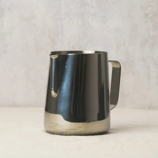 Professional quality straight sided Yagua Foaming Milk Jug with lined measurements etched on both sides for right and left handed milk frothing, improved accuracy and less wastage. Narrow spout for superior pouring control and latte art