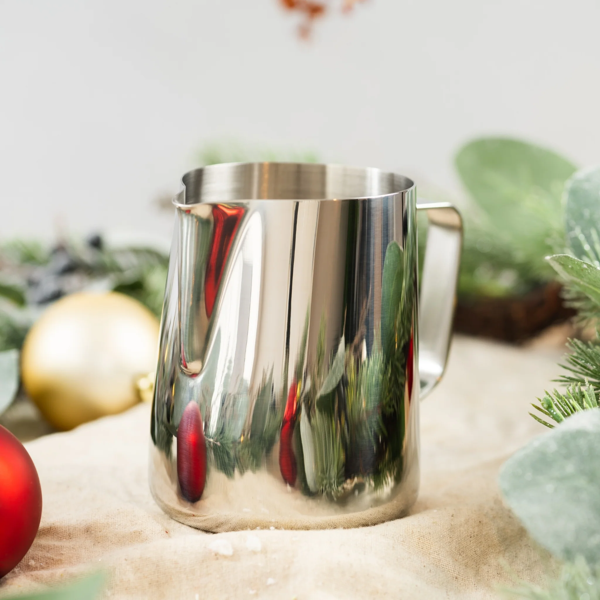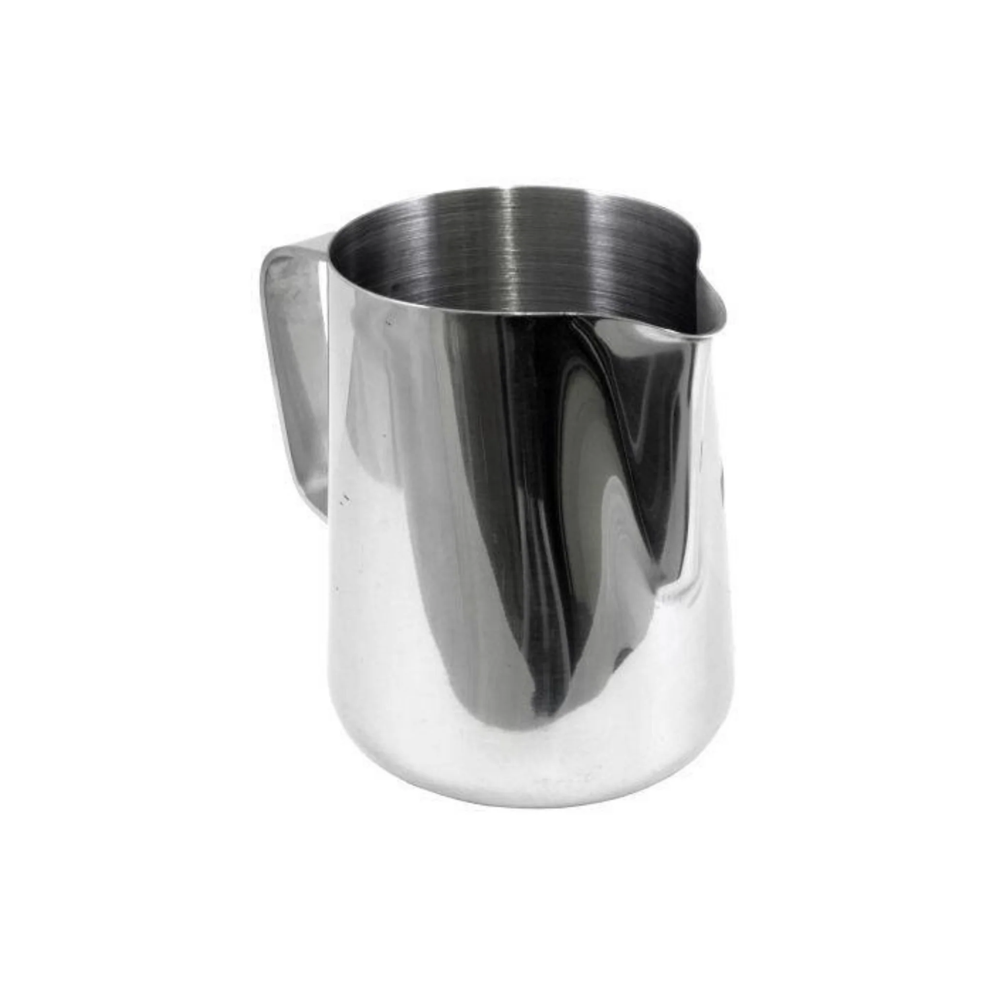 Professional quality straight sided foaming jug with lined measurements etched on both sides for right and left handed milk frothing, improved accuracy and less wastage.